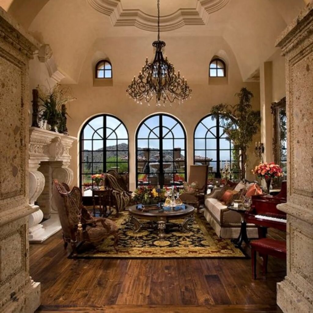 Luxury interiors are more than just beautiful spaces — they are experiences. They combine architecture, materials, lighting, and furniture to create rooms that feel both impressive and welcoming. The two interiors below perfectly capture this balance: one reflects refined classical elegance, while the other embraces rustic warmth and old-world charm.