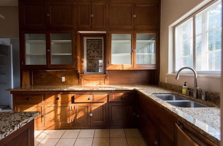 The first kitchen is centered around warm, medium-to-dark wood cabinetry. The natural grain and tone of the wood create depth and character throughout the space. Unlike painted cabinets, stained wood highlights texture and craftsmanship, giving the kitchen an authentic and grounded appearance.