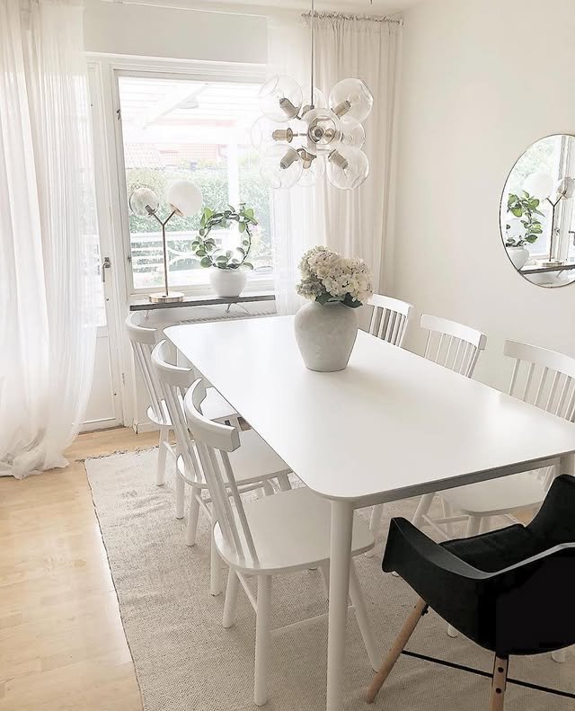 The Black Anchor: To keep the room from feeling too “soft,” the designer introduced sharp black accents. The black-framed windows and the thin metal legs of the dining chairs provide a modern, graphic edge that grounds the lighter tones.