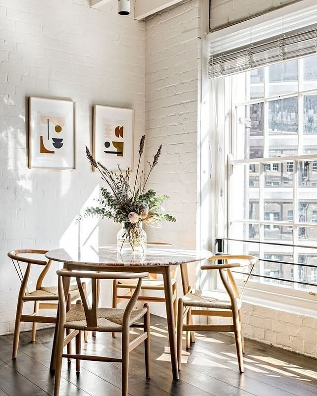 Wood is the most effective tool for grounding a high-ceilinged or open-concept space. While white walls and large windows provide the “air,” a substantial wood table or a series of oak accents provides the “earth”. By repeating a specific wood tone at different heights—from the floor to the tabletop to a wall shelf—you create a cohesive visual thread that makes a house feel like a home.