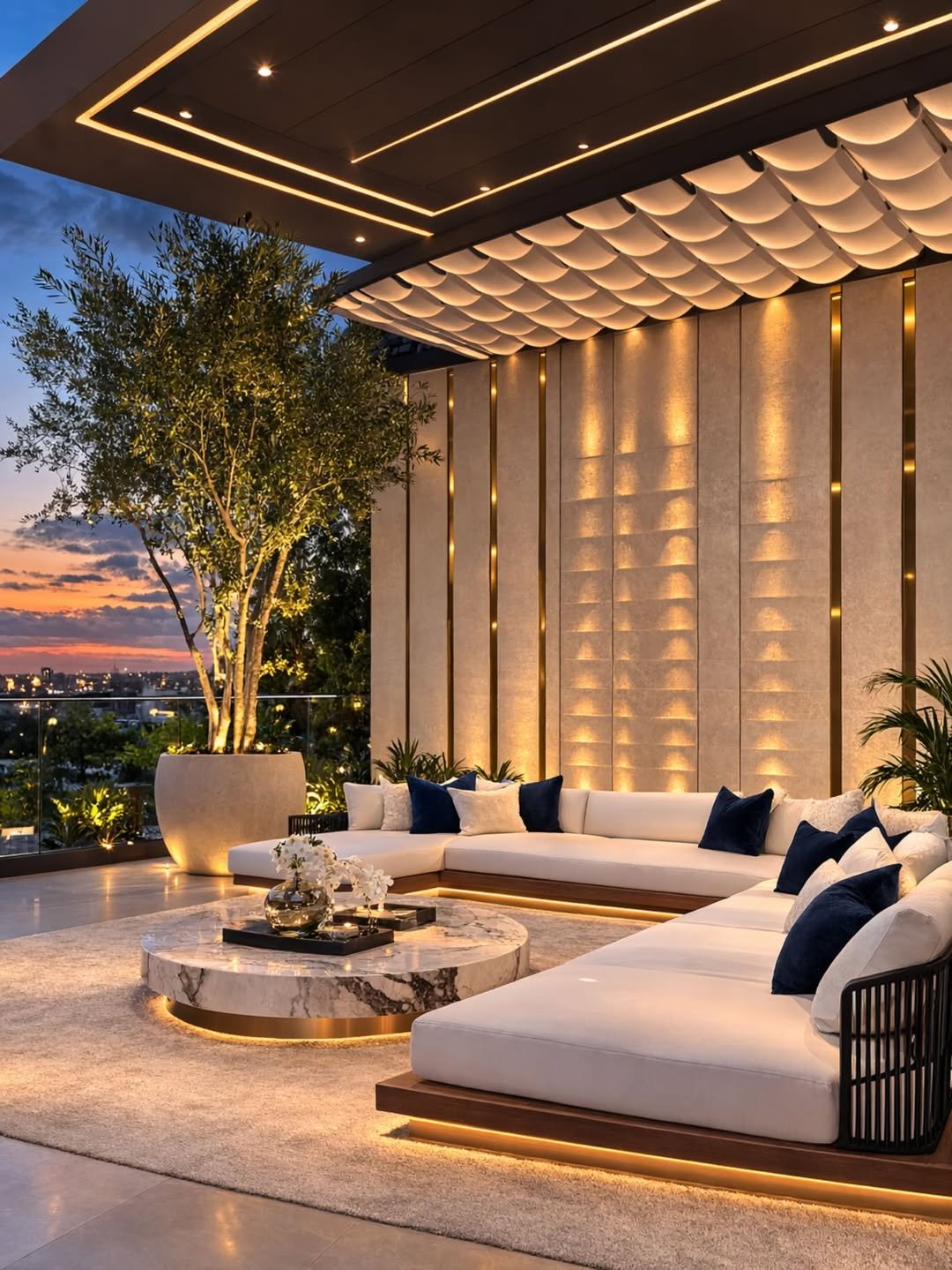 Atmospheric Lighting: To transition the space for evening use, layer your lighting. While overhead pendants provide functional light, portable lanterns and integrated floor lighting create “pools of warmth” that mimic the cozy glow of a living room lamp.