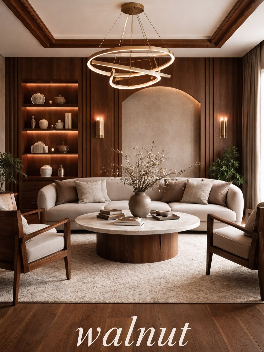 Material Contrast: Pairing the dark, matte finish of walnut with a white marble coffee table creates a high-end sensory richness that defines modern luxury.
