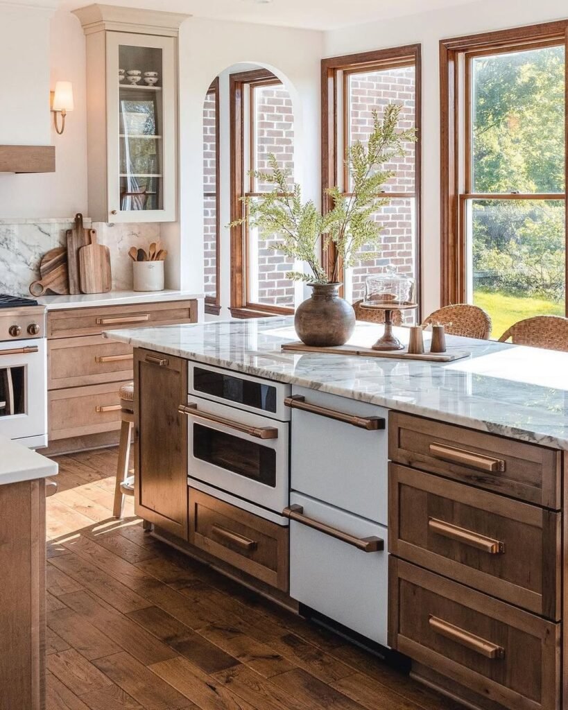 The Focal Point: Introduce a dark, stained wood for the island. This creates a “furniture-piece” feel rather than just a workspace.