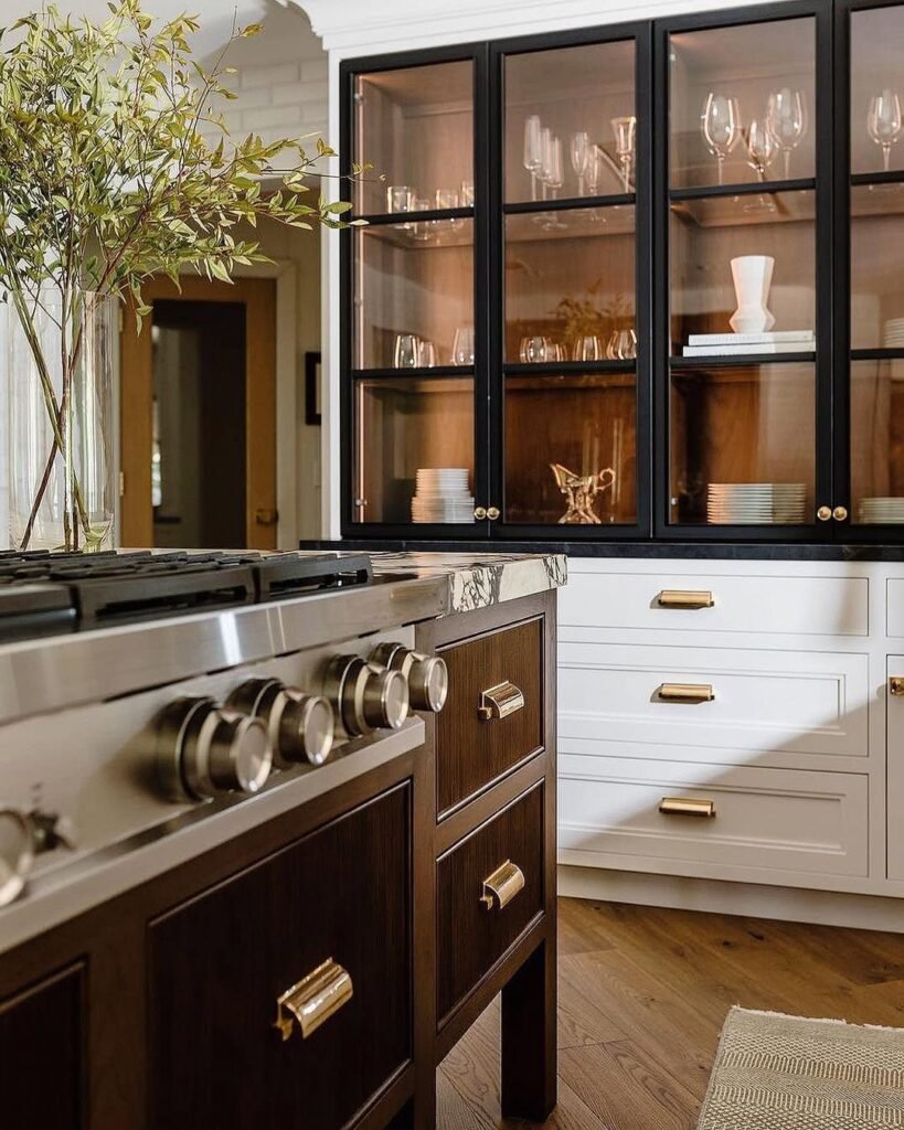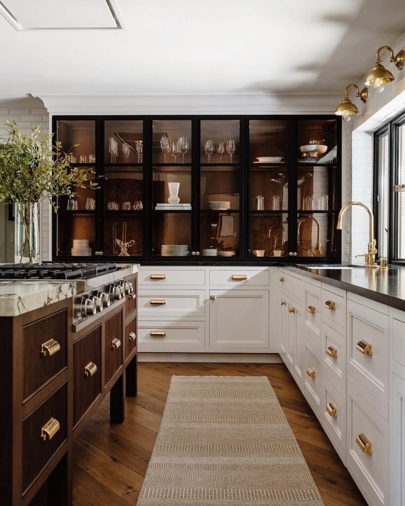 The Accent: Black-framed glass display cabinets. These act as the “windows” of your cabinetry, allowing you to showcase heirloom crystal and stoneware, especially when integrated with warm interior LED lighting.