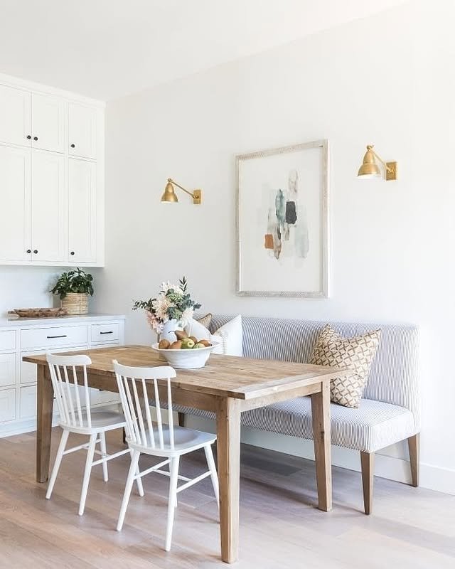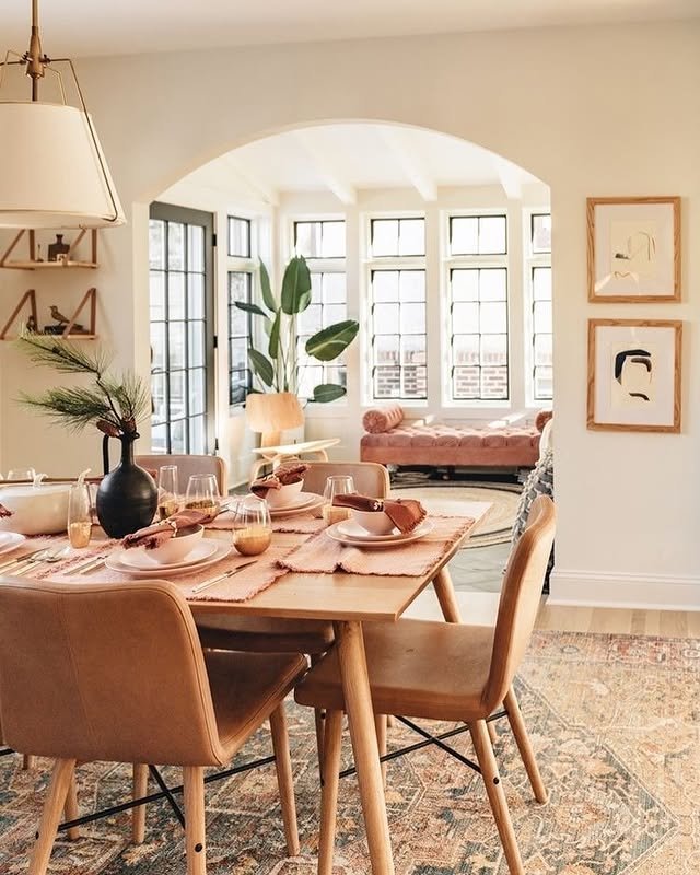 Structured Proportions: The symmetry of the windows and the centered placement of the dining set evoke a formal, classical layout, but the lack of heavy drapery or ornate trim keeps the energy light and contemporary.