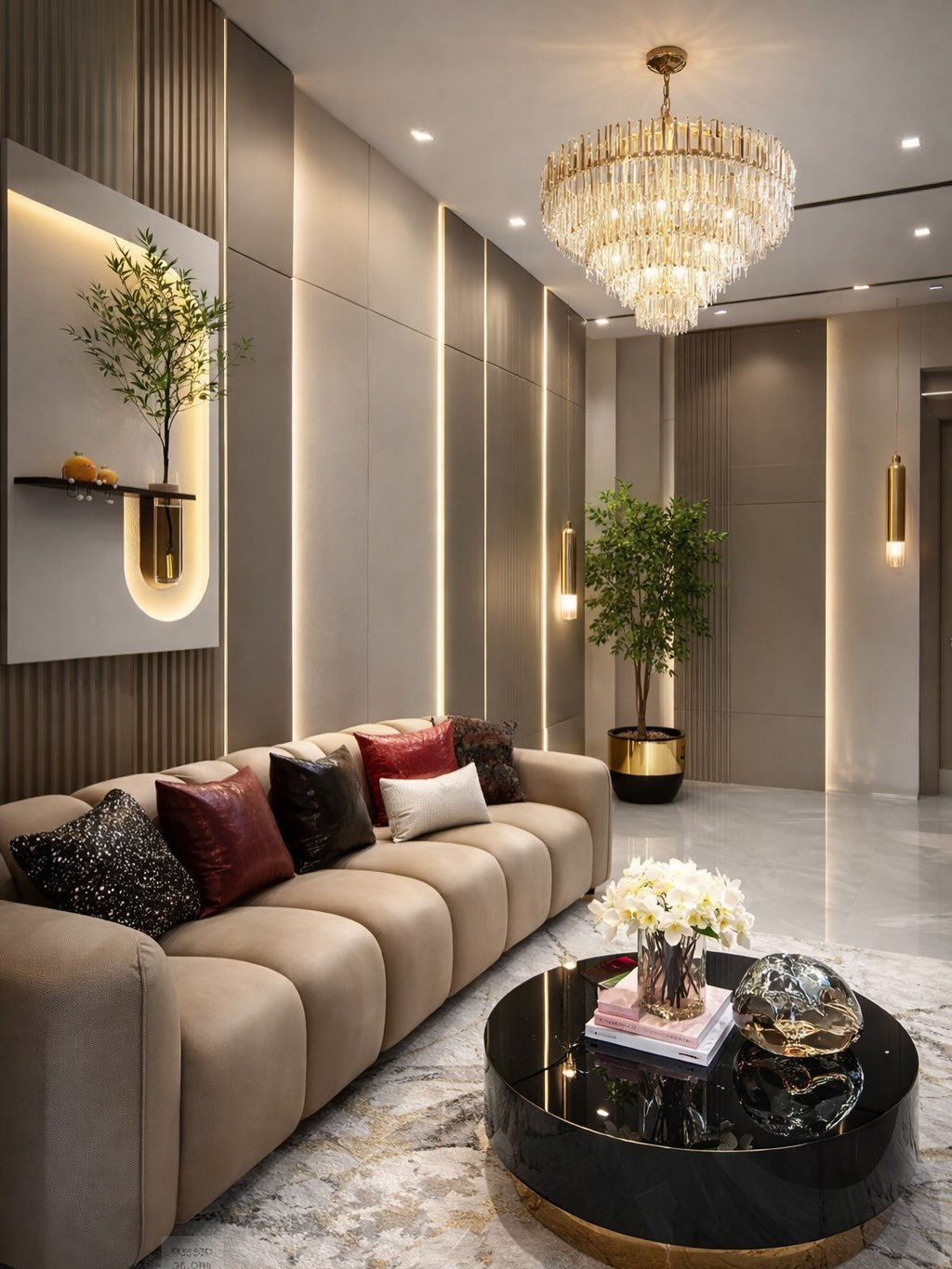 Biophilic Verticality: A tall, slender vase with fresh green branches provides a pop of life. During the day, the leaves look vibrant and fresh; at night, they become a dramatic, backlit silhouette.