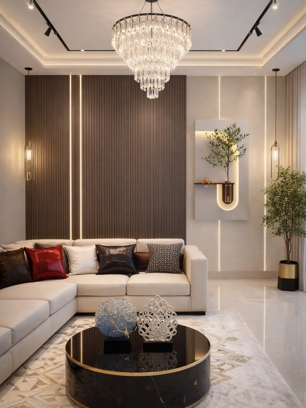 Lighting in this space serves as the primary sculptural centerpiece, providing both functional illumination and visual drama.
