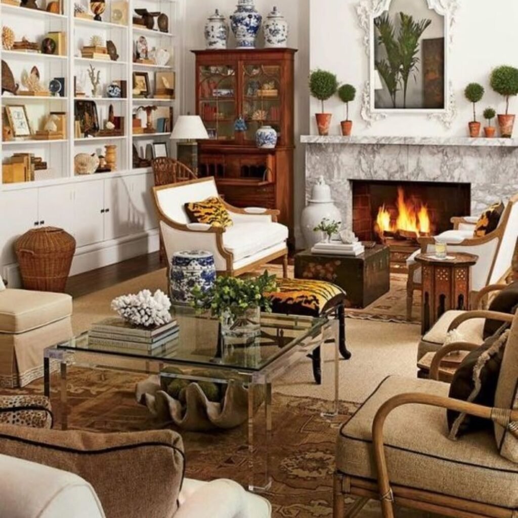 Built-in shelves filled with books, ceramics, and decorative objects add personality to the room. Each piece contributes to a sense of history and character. The mix of materials—wood, glass, fabric, and stone—creates depth while maintaining a balanced, elegant look.