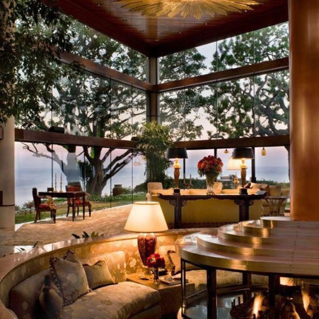 Modern interiors are increasingly designed to remove barriers between the inside and the outside. In the first space, expansive glass walls stretch from floor to ceiling, allowing natural light and outdoor scenery to become part of the room. The surrounding trees, sky, and distant views create a living backdrop that changes throughout the day, giving the interior a dynamic and refreshing atmosphere.