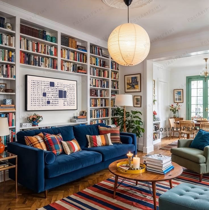 Symmetrical Displays: Built-in white shelving and 2×2 art grids provide a structured way to display colorful collections and curated decor.