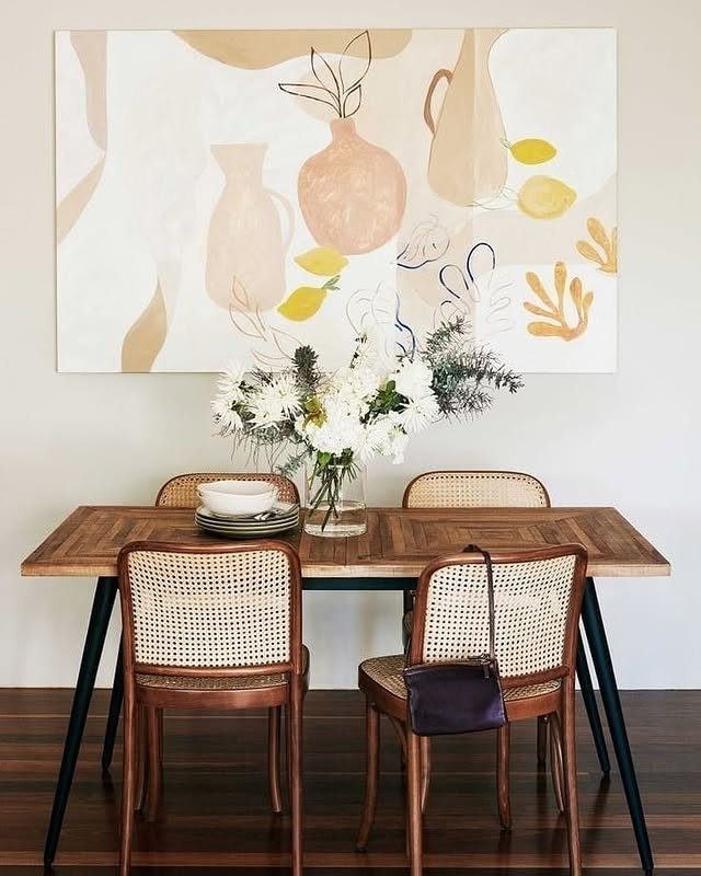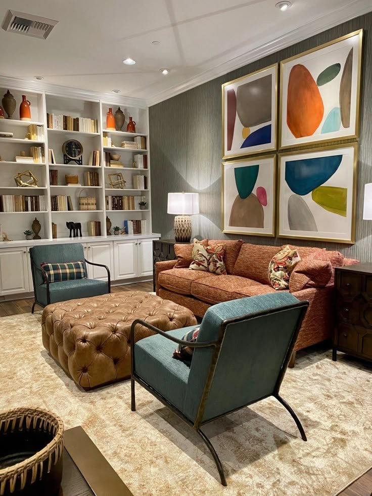 Tonal Echoes: Designers frequently pull secondary colors from the artwork—such as burnt orange, teal, or violet—and repeat them in upholstery and tabletop floral arrangements to create a unified flow.
