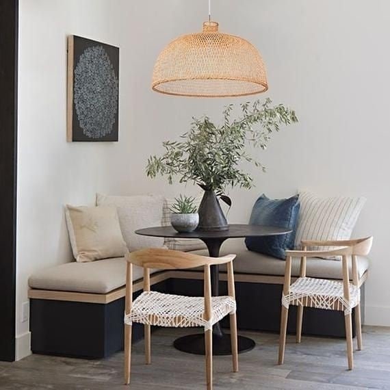 Sculptural Woven Pendant: Hanging low over the table is a bell-shaped pendant made of woven natural fibers. This choice echoes the texture of the rug and casts a soft, atmospheric light that makes the dining experience feel intimate.