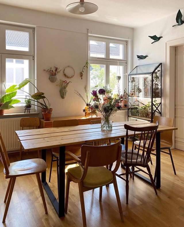 Repetitive Silhouettes: The rounded backs of the chairs provide a gentle, flowing silhouette that contrasts with the rectangular solid wood dining table.