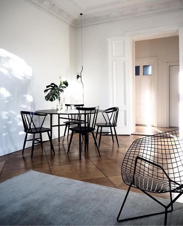 Black Spindle Chairs: The black Windsor-style chairs are a recurring favorite in modern-traditional homes. Their slim, vertical spindles provide a graphic “pop” and keep the visual flow open around the solid wood table.