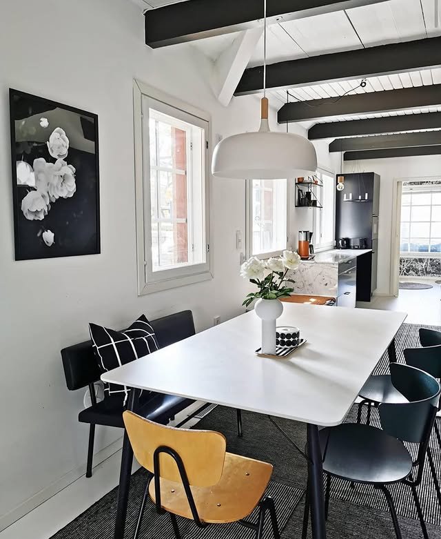 This open-concept dining area is a beautiful representation of “Japandi” style—a hybrid of Japanese artistic minimalism and Scandinavian functionality. The room relies on a palette of soft whites, light woods, and black accents to create a space that feels disciplined yet deeply comfortable.
