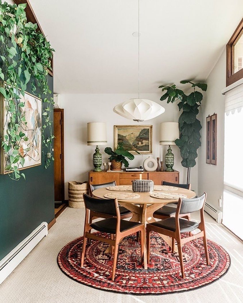 This dining room is a vibrant example of how to execute “New Retro” design—a style that honors the iconic silhouettes of the 1950s and 60s while grounding them with modern textures and lush greenery. By layering a circular rug over a neutral base and utilizing varied wall treatments, the space feels curated, energetic, and full of personality.