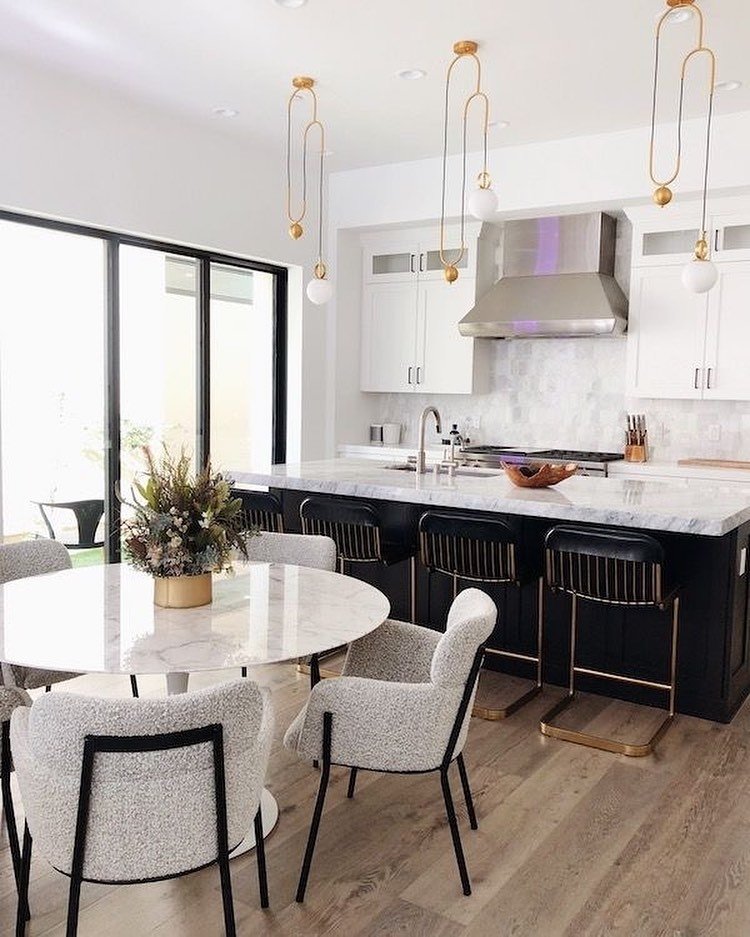 Linear Counter Stools: At the island, the black and gold counter stools feature a vertical linear back design. This introduces a rhythmic, graphic element that contrasts beautifully with the smooth curves of the dining chairs.