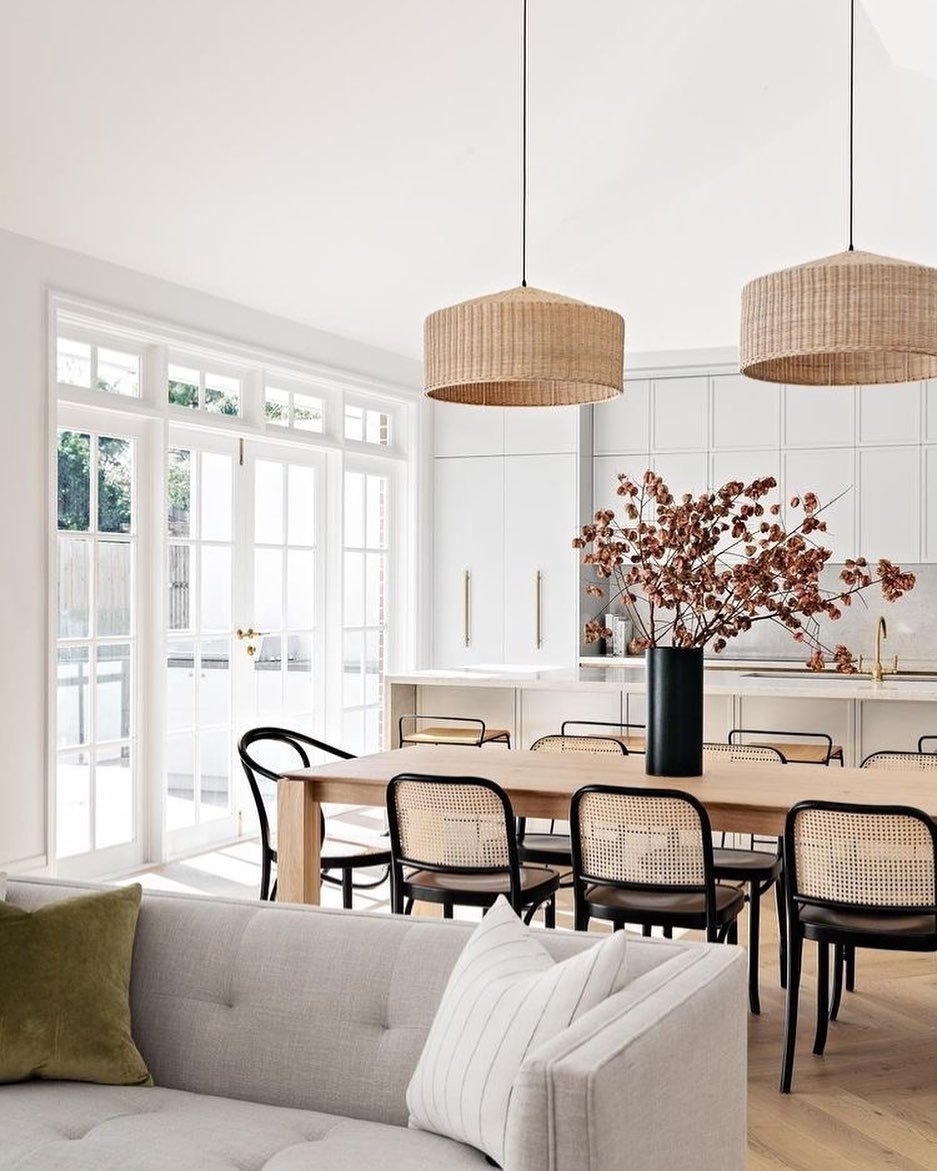 Cane Back Chairs: The black-framed dining chairs with cane webbing introduce a classic “bistro” texture. The use of natural cane adds an organic, handmade feel that softens the clean lines of the kitchen cabinetry in the background.