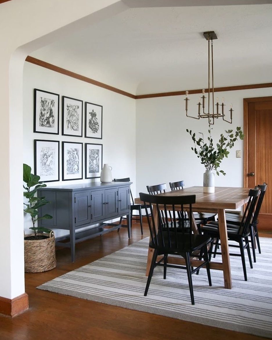 To make a room feel intentional, look for ways to “echo” colors and shapes. In this space, the black of the chairs is echoed in the art frames; the wood of the table is echoed in the wall trim; and the grey of the sideboard is echoed in the stripes of the rug. These repetitions are what make a multi-piece room feel like a singular, cohesive thought.