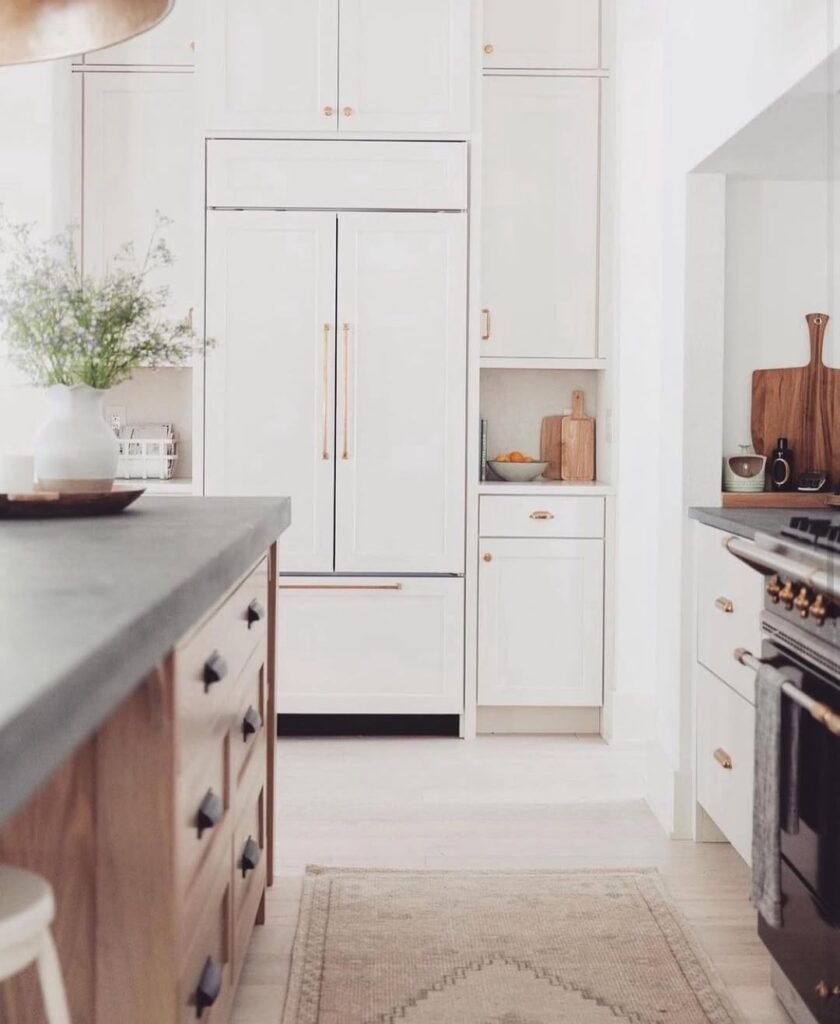 Gold or brass hardware introduces warmth and a touch of sophistication. Wooden cutting boards and decorative elements add texture and keep the space from feeling too minimal.