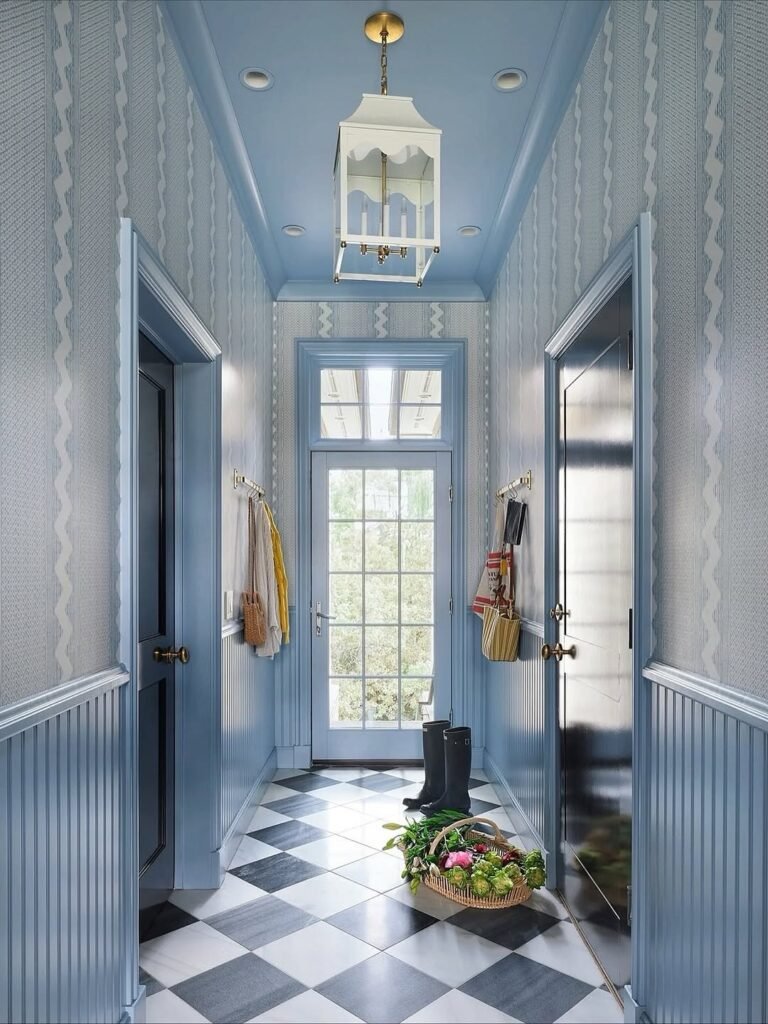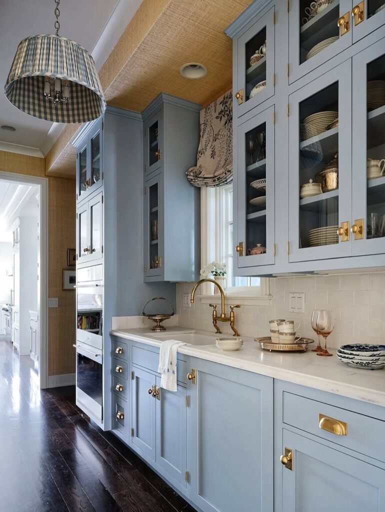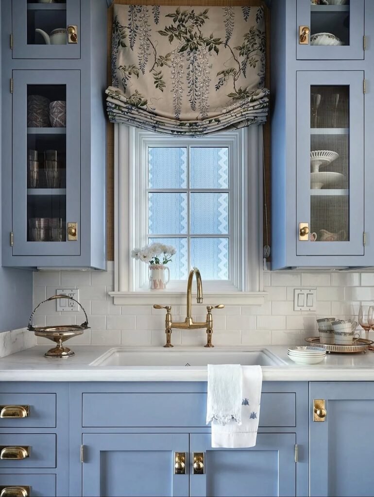 The Living Patina: We favor “living finishes” like unlacquered brass and forged gold. These materials do not stay stagnant; they evolve. Over time, they develop a rich, weathered character that reflects the life lived within the home. Against the backdrop of custom-painted blue cabinetry, these warm metals provide a luminous, high-contrast finish.