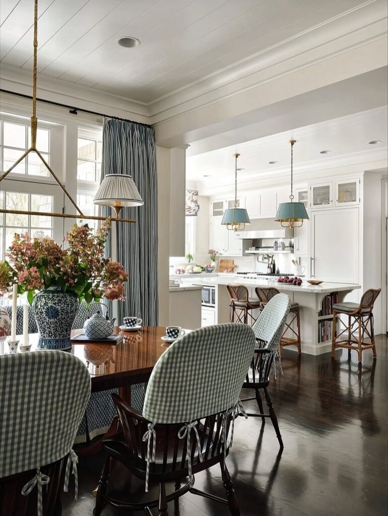 • Maximalist Comfort: We pair traditional mahogany tables with high-back seating draped in classic patterns like gingham and wisteria prints.